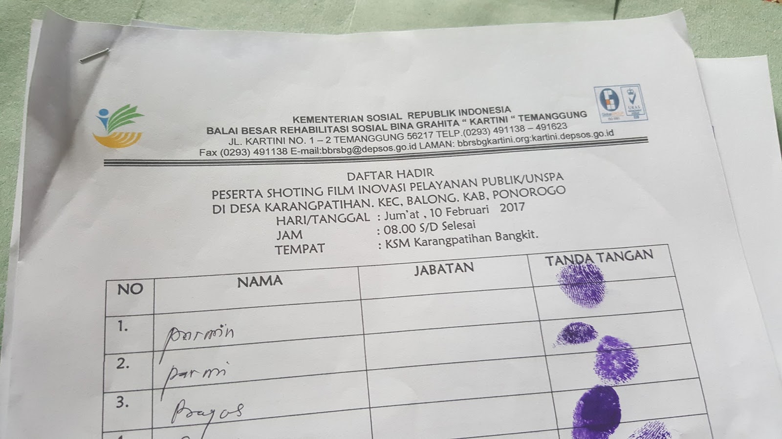 Jumat 10 Februari 2017 berlangsung shoting pembuatan Video Inovasi Pelayanan Publik bersama Kementrian Sosial Republik Indonesia, Balai Rehabilitasi Sosial Bina Grahita Kartini Temanggung, di Desa Karangpatihan Kecamatan Balong Kabupaten Ponorogo.